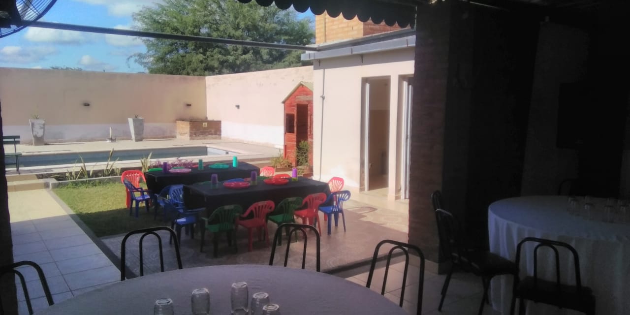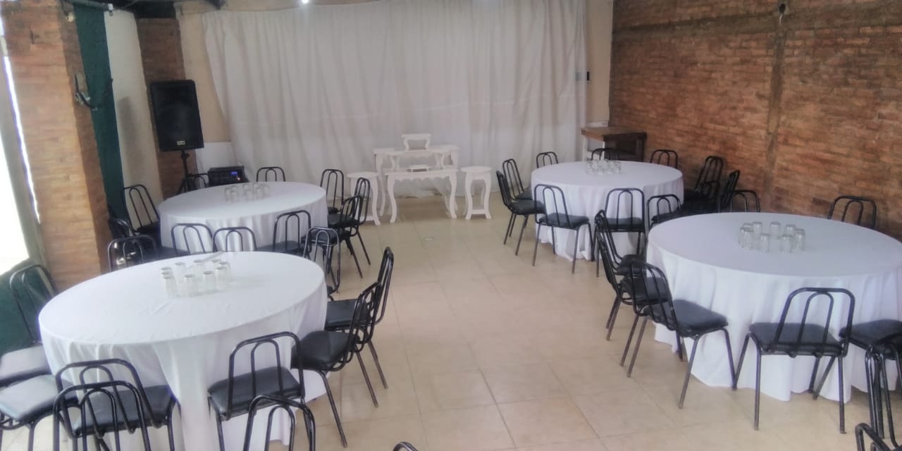 Quincho cerrado, Mesas, sillas, vajillas, manteles, freezzer, horno electrico, pava electrica, equipo de musica, 2 baños, asador grande con mesada. Adicional: mesas de candy bar con 8 accesorios, mesitas, sillitas, manteles y vajillas para los niños. Capacidad maxima de 50 personas. Para cumple infantil es hasta de 80 personas, entre grandes y niños.